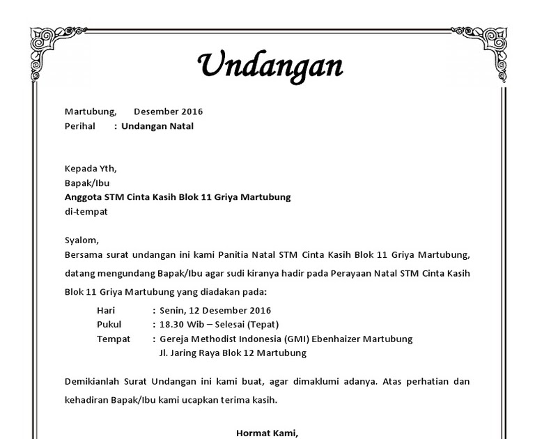 Contoh surat undangan natal 2019 kumpulan contoh surat dan proposal. Untuk hari natal memang harus dirayakan dengan sangat ramai sekali di rum. Contoh surat undangan perayaan natal terbaru gereja kumpulan. Bersama surat ini, kami segenap panitia natal gpdi immanuel km. Artikel ini akan memberikan banyak refrensi contoh undangan natal yang bagus, unik dan kreatif bagi kalian yang sedang merencanakan acara natal.